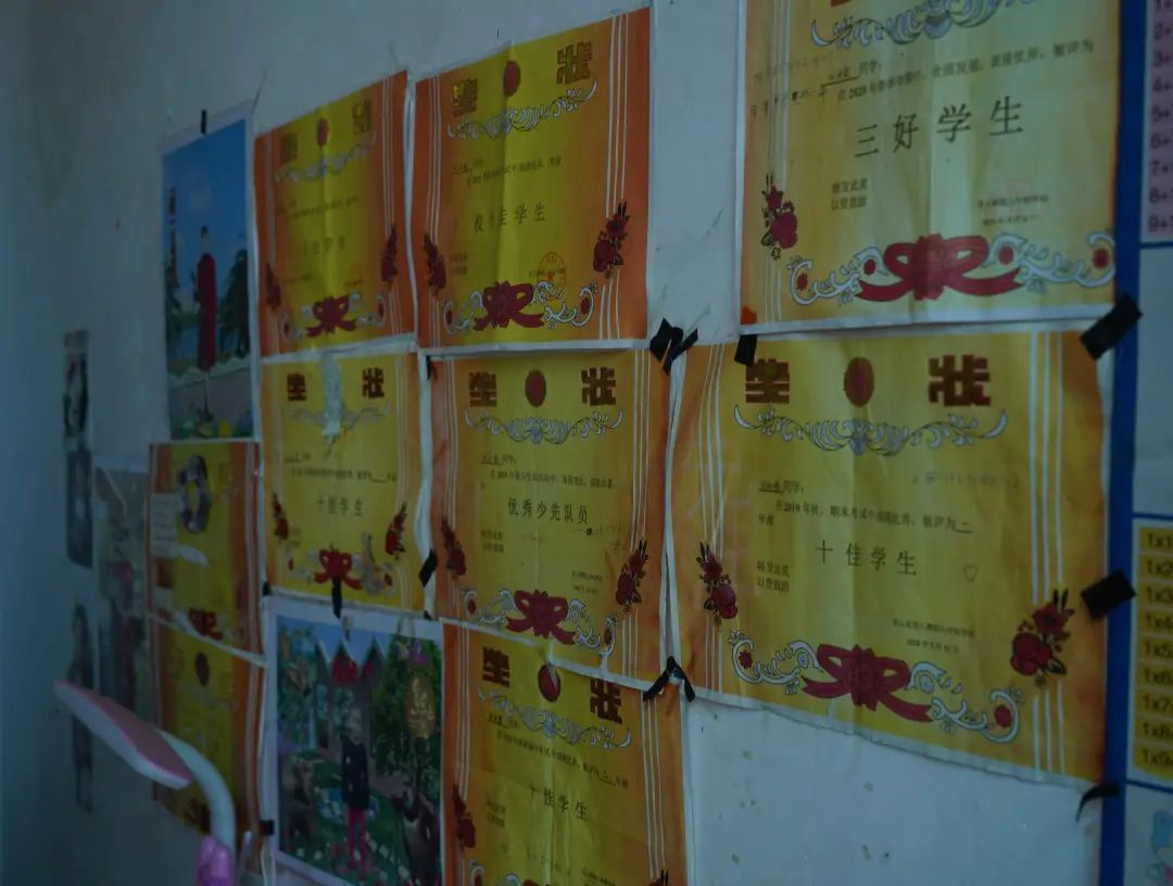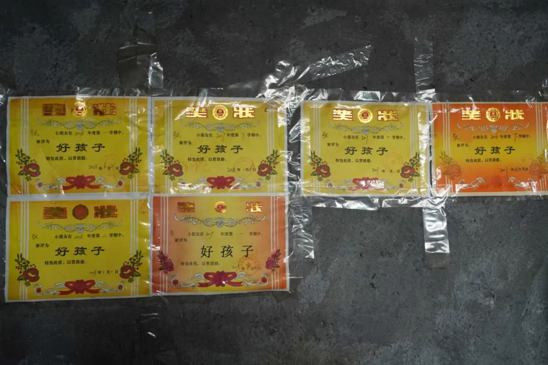 ▲被資助孩子在學(xué)校表現(xiàn)優(yōu)異,獎狀貼滿墻