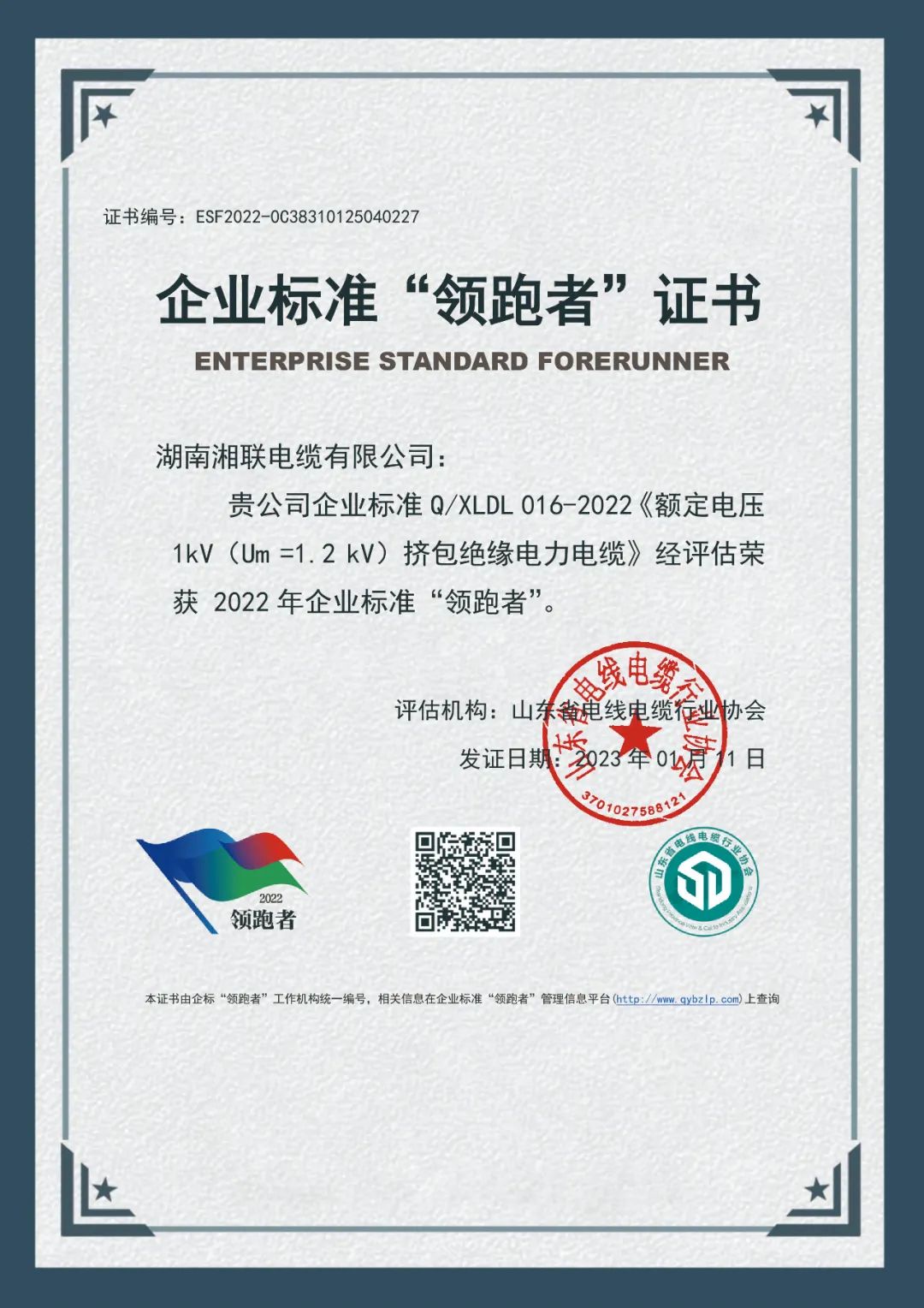 近日,湖南湘聯(lián)電纜有限公司企業(yè)標(biāo)準(zhǔn)Q/XLDL 010-2022《額定電壓 6kV(Um=7.2kV)到 35kV(Um=40.5kV)擠包石墨烯內(nèi)外屏蔽交聯(lián)聚乙烯絕緣電力電纜》、Q/XLDL 016-2022《額定電壓 1kV(Um =1.2 kV)擠包絕緣電力電纜》、Q/XLDL 017-2022《額定電壓450/750V及以下銅芯聚氯乙烯絕緣環(huán)保家裝布電線》三項(xiàng)產(chǎn)品經(jīng)評定機(jī)構(gòu)評估,榮獲2022年全國企業(yè)標(biāo)準(zhǔn)“領(lǐng)跑者”。