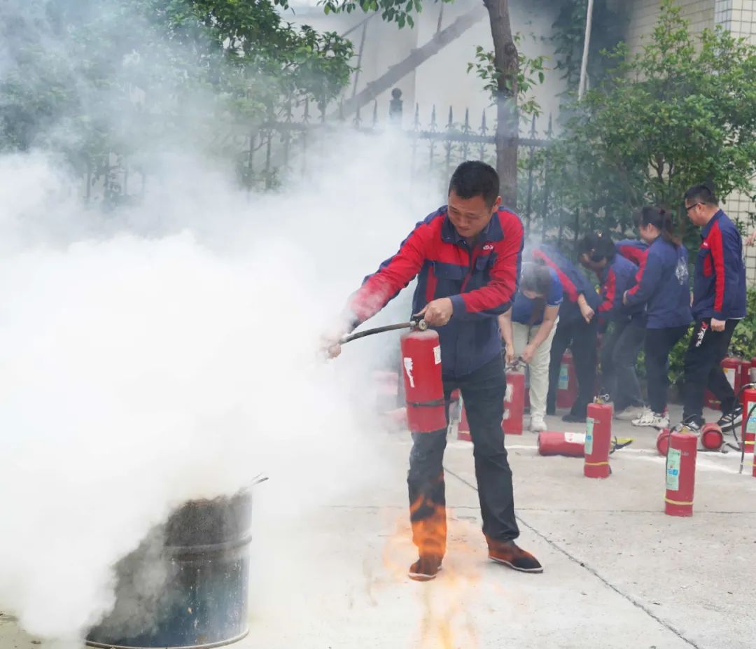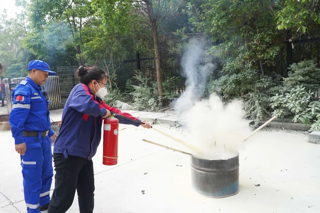 本次演練以實操為主,為確保所有員工具備基本消防能力,每一位員工都在專業消防隊員的指導下,完成了使用滅火器撲滅火堆、消防水槍對接等實際操作,切實增強員工的自防自救能力
